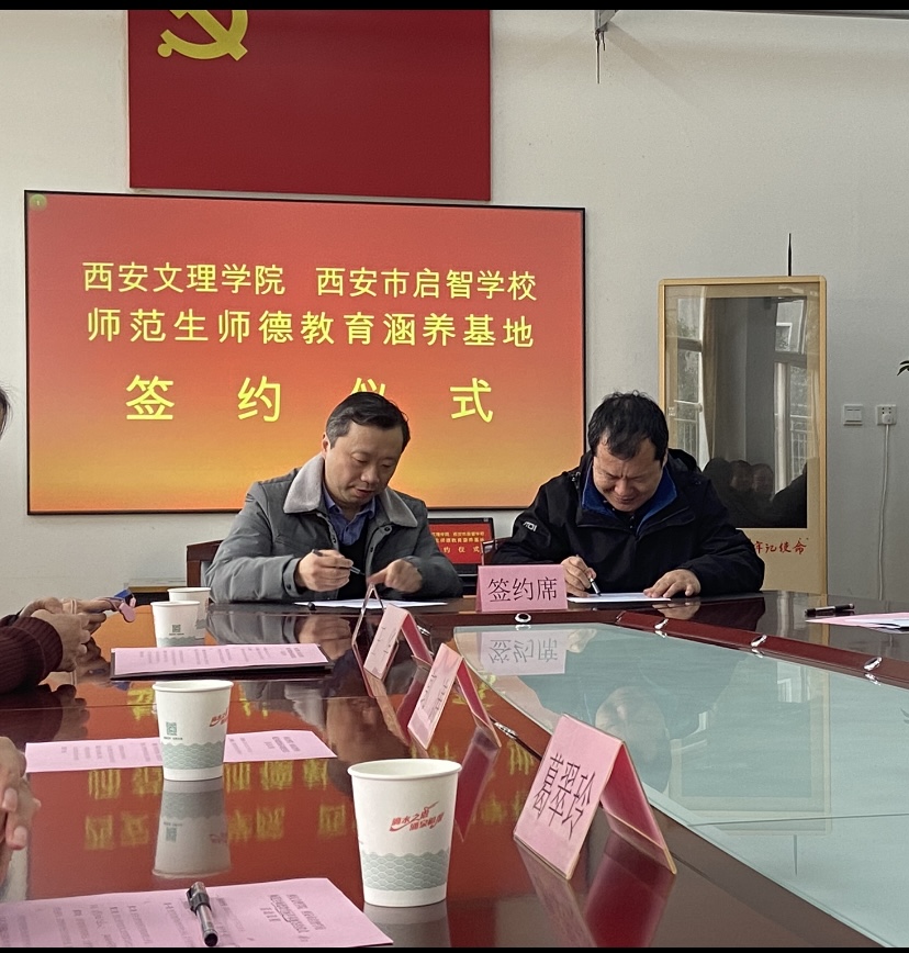 12月3日下午,我校师范学院、信息工程学院与西安启智学校共建师范生师德教育涵养基地签约挂牌仪式在启智学校举行,师范学院院长郭涛、信息工程学院书记葛翠玲,两个学院副院长王华、张力宁、教研室主任,以及师范学院20余名学生代表一同参加。